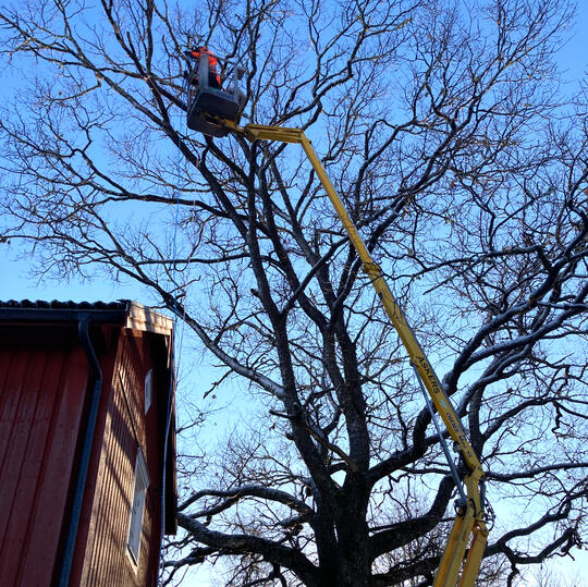 Ett förändrat klimat innebär stora påfrestningar på många träd och riskerna för att träd blir sjuka eller blåser ner blir större. Vi värnar om träden, men ibland riskerar de att falla och vålla skador på omgivningen. Ett alternativ kan ibland vara att beskära trädet eller att säkra kronan med band, något vi också kan hjälpa dig med.Vi kan hjälpa till med allt från enklare trädfällning till precisionsfällning med vinsch, eller sektionsfällning med skylift om det är trångt eller stor risk för byggnader och annat i omgivningen.Hör av dig om du vill ha hjälp så kommer vi ut och tittar och ger ett prisförslag!